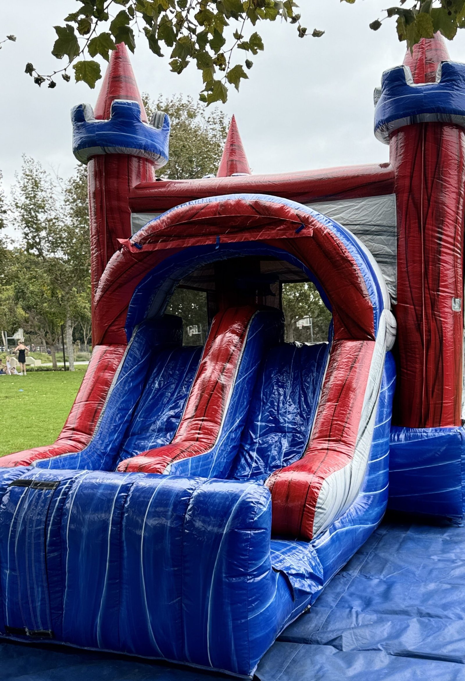 3-1 Cars Dual Lane Combo, Dimensions: 26L 17W 15H basketball hoop, Feature and a super fun dry slide! Setup Area Requirements: Setup area of at least: 28ft x 17ft x 15ft. Slide Bouncer measures Clear, 3′ x 6′ pathway to the setup area. 1 – Standard (120v/20a) electrical outlet. Generators are required for Parks/Fields. Sorry, we cannot set up on dirt, rocks, sand.